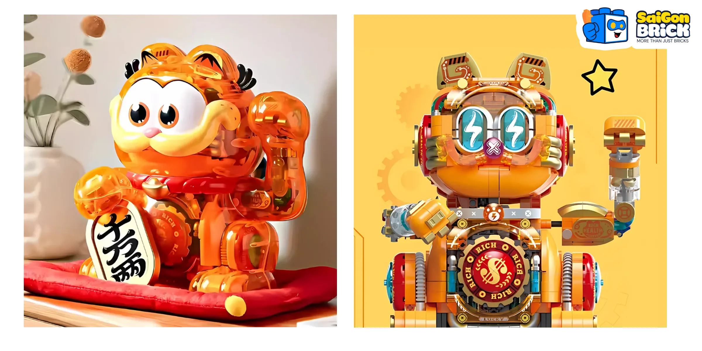- FEIMIBOX S43006 – Lucky Cat Garfield (1178pcs): Một sự kết hợp thú vị giữa văn hóa truyền thống và nhân vật hoạt hình nổi tiếng! Mèo Thần Tài Garfield với dáng vẻ mập mạp, hài hước, tay cầm câu đối đỏ chắc chắn sẽ mang lại tiếng cười và tài lộc cho gia chủ.