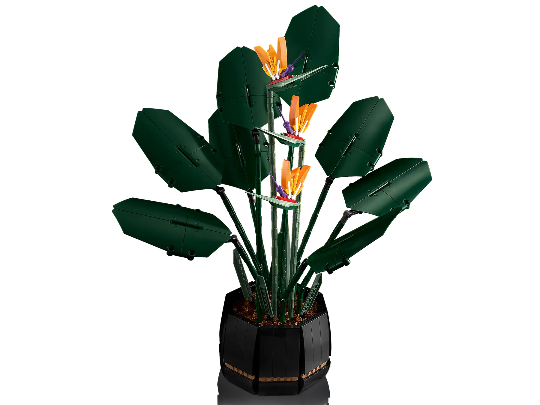 - Use the repositionable flowers and leaves to style the Bird of Paradise model and create your display piece, presented in a black LEGO flowerpot.