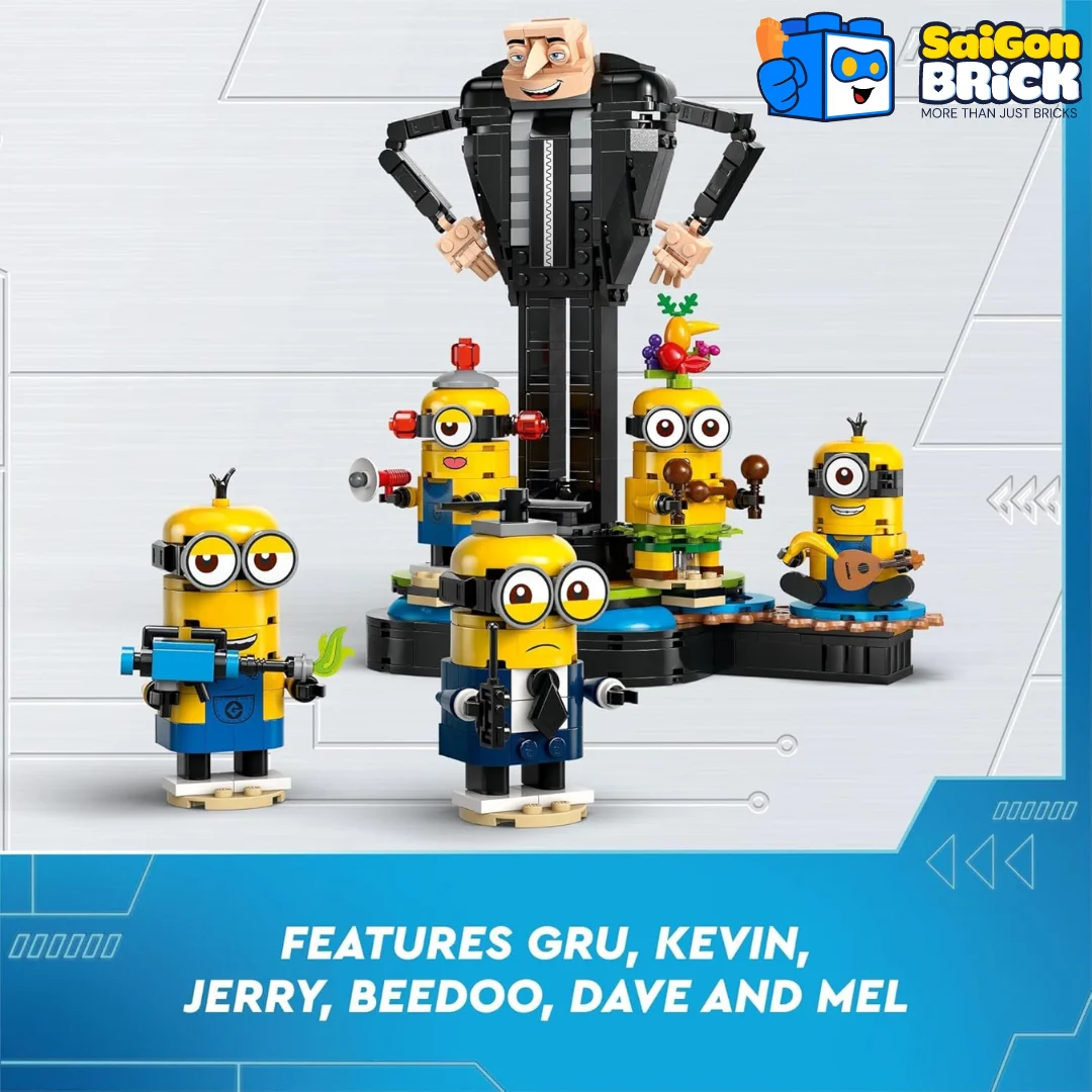 5 Minions with accessoriesJerry, Dave, Beedoo, Mel, and Kevin are buildable Minion figures. |